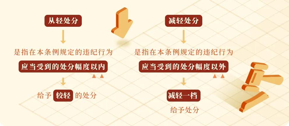 《中國共產黨紀律處分條例》規定有下列行為之一的,可以從輕或者減輕處分:	 		 		  (一)主動交代本人應當受到黨紀處分的問題。	 		 		  “主動交代”是指涉嫌違紀的黨員在組織談話函詢、初步核實前向組織交代自己的問題,或者在談話函詢、初步核實和立案審查期間交代組織未掌握的問題。	 		 		  (二)在組織談話函詢、初步核實、立案審查過程中,能夠配合核實審查工作,如實說明本人違紀違法事實。	 		 		  這種情形是指被審查黨員在組織談話函詢、初步核實、立案審查過程中,如實說明組織已經掌握的本人違紀違法事實。	 		 		  (三)檢舉同案人或者其他人應當受到黨紀處分或者法律追究的問題,經查證屬實,或者有其他立功表現。	 		 		  “同案人”指與被審查人共同參與、實施了違紀行為的人,其中既包括黨員和黨的組織,也包括非黨員和非黨組織。	 		 		  “其他人”指沒有與被審查人共同參與、實施違紀行為的人,既包括黨員和黨的組織,也包括非黨員和非黨組織。	 		 		  “有其他立功表現”,是指提供其他案件的重要線索,阻止他人違法犯罪活動,協助抓捕其他職務犯罪案件被調查人、犯罪嫌疑人(包括同案犯),為國家挽回損失等情形。	 		 		  (四)主動挽回損失、消除不良影響或者有效阻止危害結果發生。	 		 		  “主動挽回損失”,是指違紀黨員在其實施的違紀行為已經造成損失的情況下,主動采取有效措施,挽回損失的行為。	 		 		  “消除不良影響”,是指違紀黨員在其違紀行為已經造成不良影響的情況下,主動采取彌補措施,消除影響的行為。	 		 		  “有效阻止危害結果發生”,是指違紀黨員在已著手實施違紀行為,但尚未造成危害結果的情況下,主動放棄繼續實施違紀行為,并主動采取積極措施阻止了危害結果的發生。	 		 		  (五)主動上交或者退賠違紀所得。	 		 		  這種情形是指主動將違紀所得上交組織。不包括將違紀所得退回送禮人等情形。	 		 		  (六)黨內法規規定的其他從輕或者減輕處分情形。