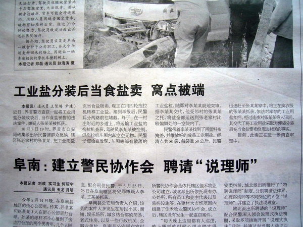 10月7日19時(shí),界首市公安局磚集派出所民警接群眾反映,轄區(qū)張老家村的張某某,把工業(yè)用鹽充當(dāng)食鹽販賣,現(xiàn)正在用四輪拖拉機(jī)轉(zhuǎn)移工業(yè)鹽。接到舉報(bào)后,民警兵分兩路前往堵截。終于,在一村莊附近的鄉(xiāng)道上,將運(yùn)輸工業(yè)鹽的拖拉機(jī)查獲,駕駛員李某某被控制,但拖拉機(jī)車廂內(nèi)卻空空無物。民警仔細(xì)檢查發(fā)現(xiàn),車廂底部有散落的工業(yè)鹽粒,隨即對(duì)李某某就地突審。據(jù)李某某交代,他受鄰村的張某某之托,將鹽全部運(yùn)送到張老家村比較偏僻處的一空院內(nèi)了。