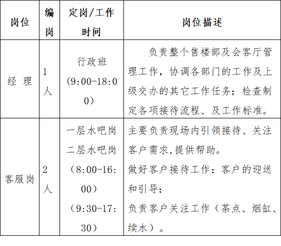 (3)客服崗:選派的客服人員必須經(jīng)過專業(yè)技能培訓(xùn),身體健康,品行良好,無違法違紀(jì)犯罪前科,具有初中以上文化程度,年齡在21至45周歲、身高1.65米以上。對現(xiàn)場的客戶接待服務(wù)工作有一定的意識。