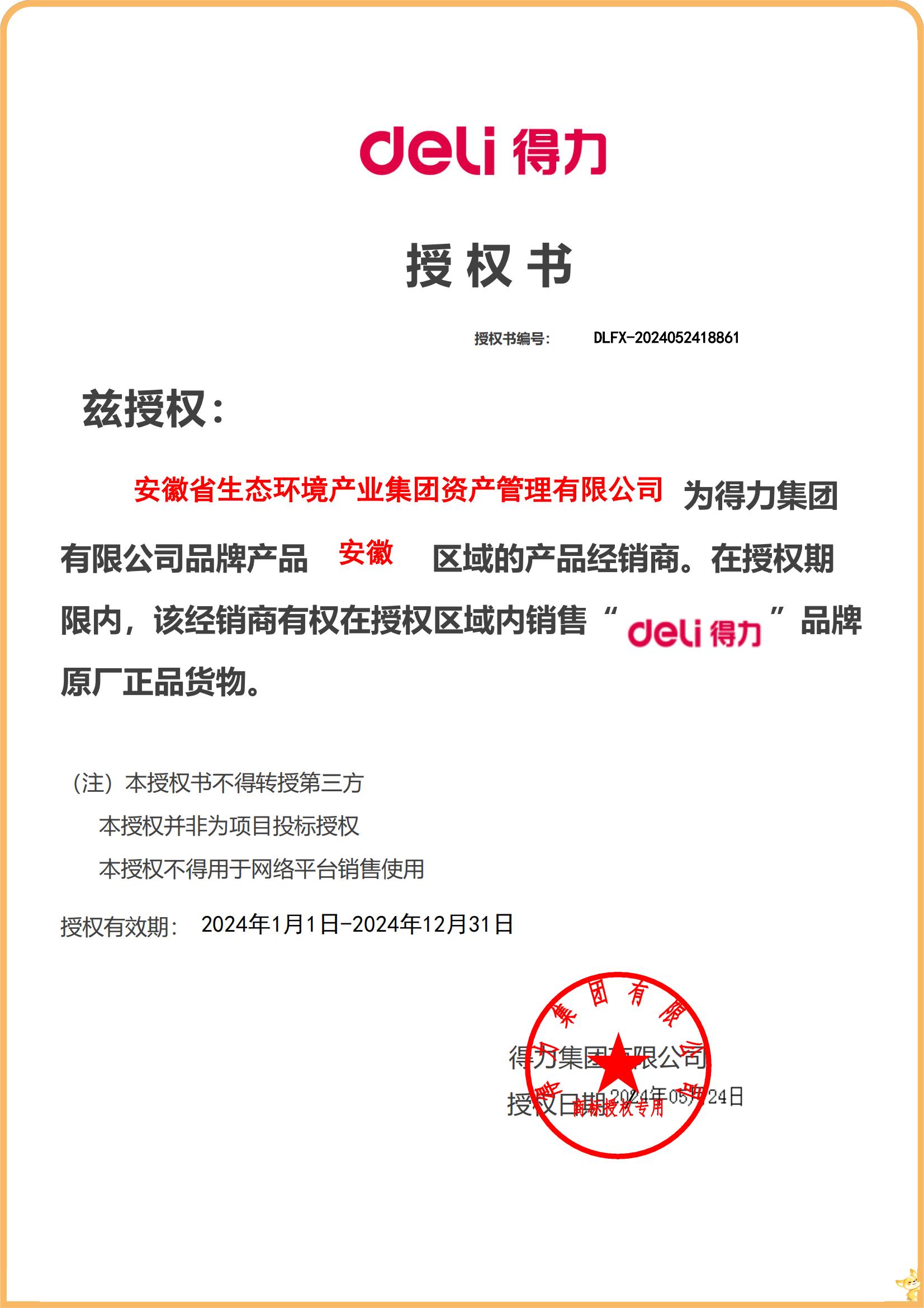 經(jīng)過不懈努力,5月24日,省生態(tài)環(huán)境產(chǎn)業(yè)集團資產(chǎn)管理公司獲得中國最大的辦公與學(xué)習(xí)用品產(chǎn)業(yè)集團即得力集團的官方授權(quán)。